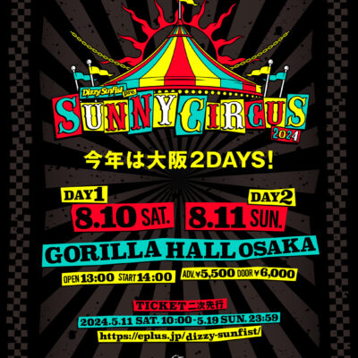 チケット一次先行 期間:2024/04/19(金)22:00~2024/05/03(金祝) 23:59 販売URL:https://eplus.jp/dizzy-sunfist/