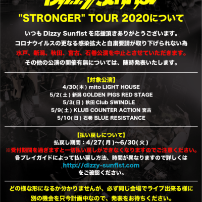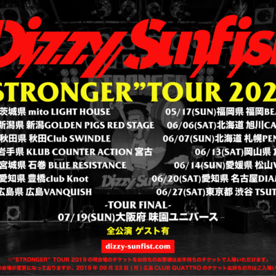 Dizzy Sunfist “STRONGER” TOUR 2019振替公演改め Dizzy Sunfist “STRONGER” TOUR 2020スケジュール発表!! Dizzy Sunfist “STRONGER”…